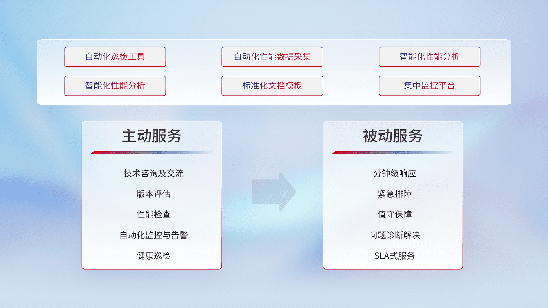 智能化工具和标准化文档,,,保障服务质量,,提供主动服务(包含技术咨询、、版本评估、、、性能检查、、、自动化监控与告警、、、健康巡检)和被动服务包含(分钟级响应、、、紧急排障、、值守保障、、、、问题诊断解决、、、SLA服务)。。。